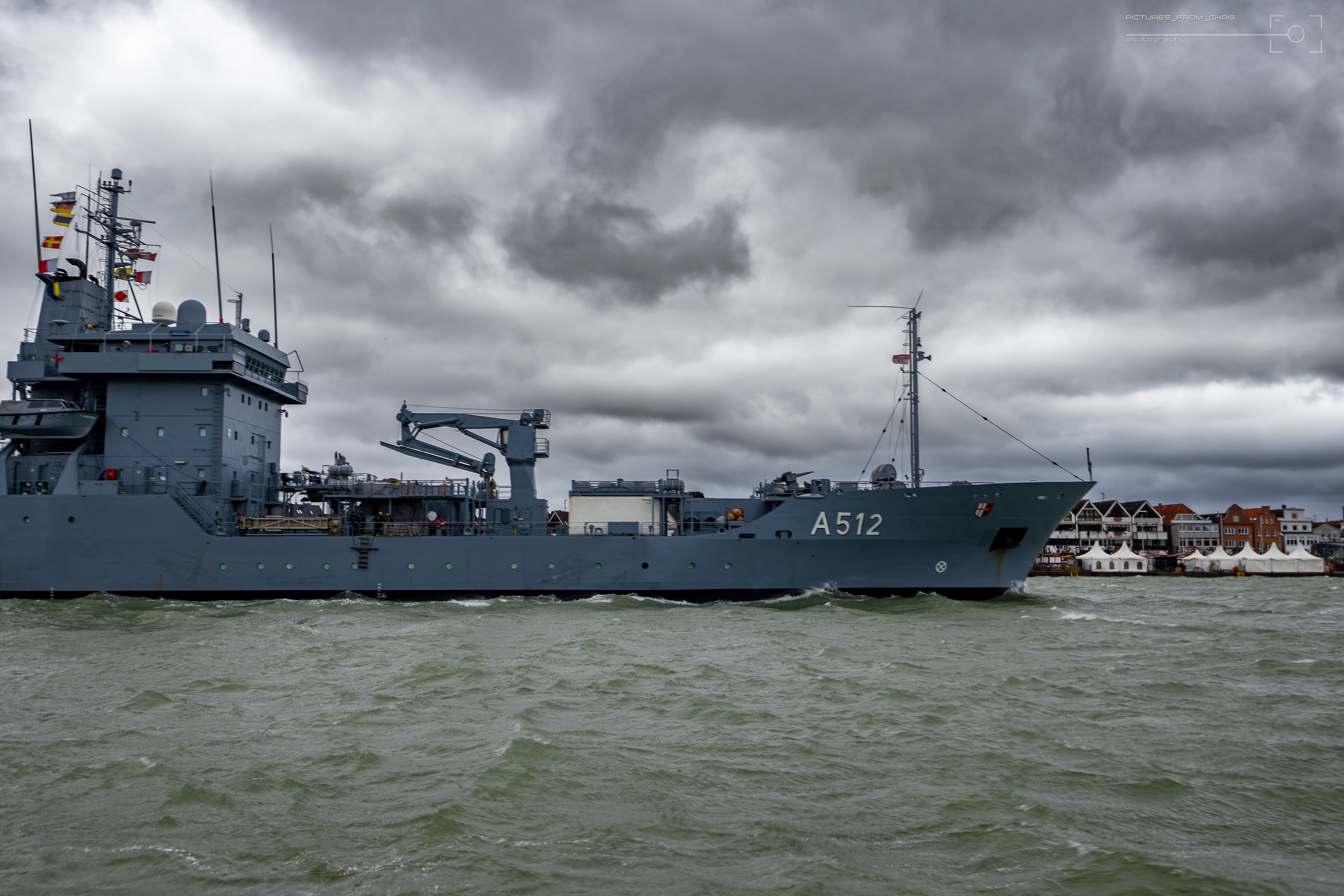 Am 09.12.2024 bin ich spontan an den Priwall-Travemünde gefahren um das norddeutsche Wetter zu genießen. Angekündigt war Sturmflutgefahr, schlußendlich war es dann "nur" ein Sturmhochwasser, da der Pegelstand die 1,5m über dem mittleren Hochwasser nicht überschritten hat. Erfreulicherweise konnte ich zufällig noch den Tender A512 der deutschen Marine ablichten. Das Schiff gehört zur den Versorgungsschiffen der Bundeswehr und war mit einer Open-Ship-Veranstaltung in Lübeck zu Besuch .